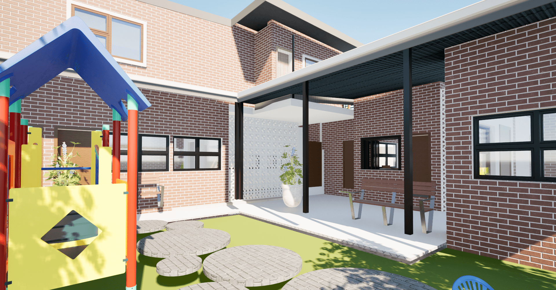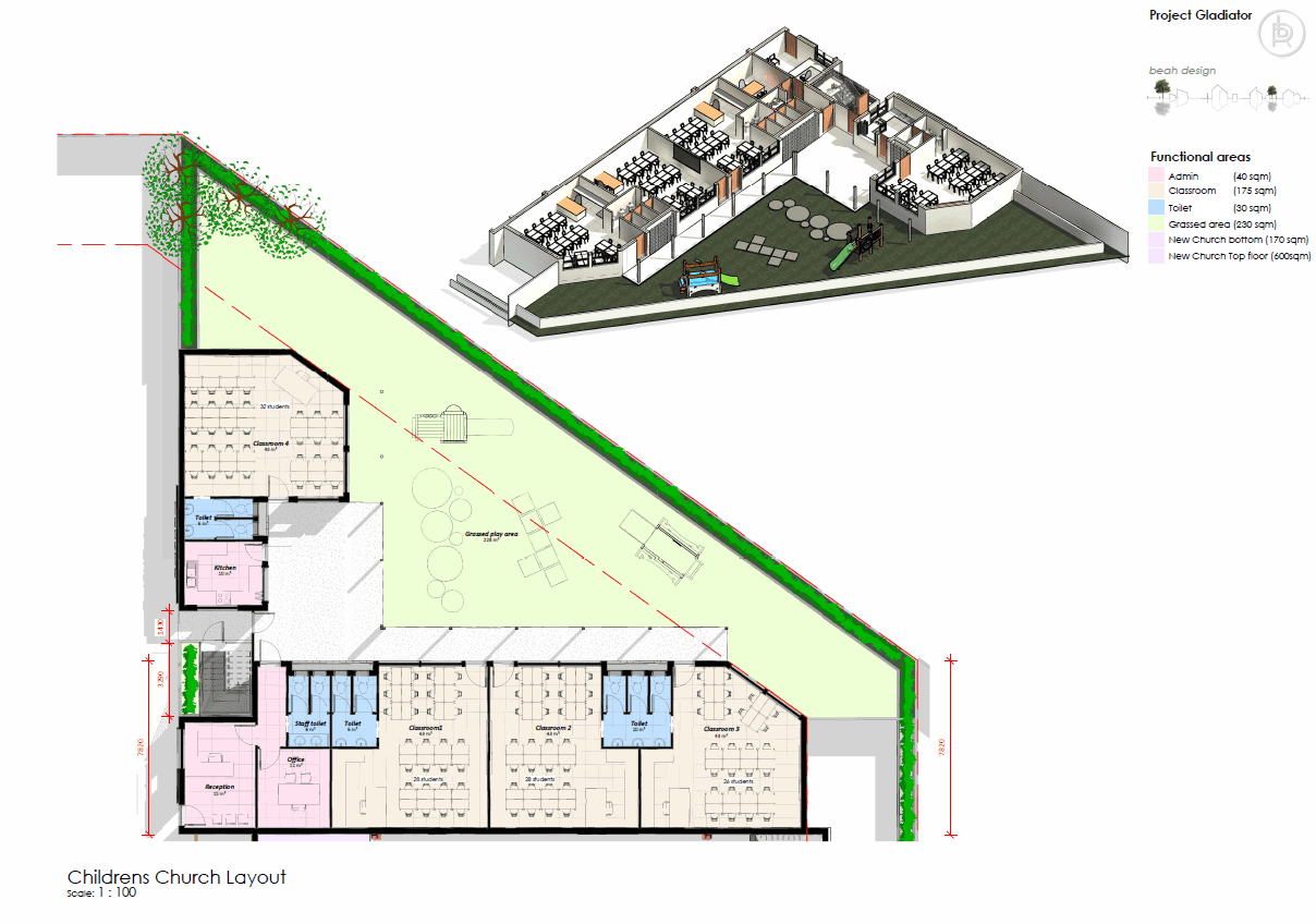 Gladiator EduCare, currently located in a cozy home in Rocklands, is expanding to a new site as an extension to a church building. The new facility includes four classrooms, student toilets, and an administration area, all designed to create a safe and functional learning environment. A secure play area is provided for children, and a small first-floor apartment accommodates on-site security, ensuring both safety and convenience for staff and students.