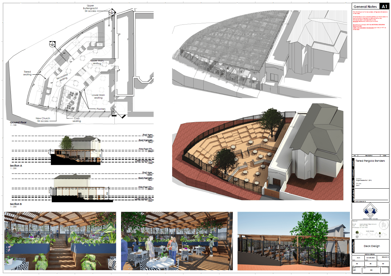 This project involved the visualisation and detailed design of a tiered pergola structure for a coffee shop in the heart of Cape Town. The design enhances the outdoor seating area, providing shade, aesthetic appeal, and a comfortable environment for patrons, while complementing the café’s architectural character and urban setting.